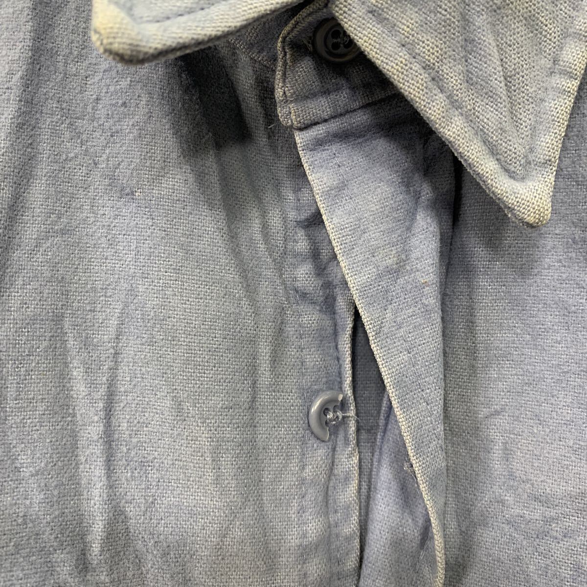 前身頃、後身頃、交互の両袖に汚れ第2ボタン破損があります。