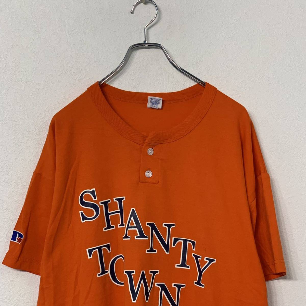 RUSSELLATHLETIC 半袖 ロゴ プリント Tシャツ L オレンジ ヘンリーネック 野球 スポーツ バックプリント 古着卸 アメリカ仕入 a508-5189