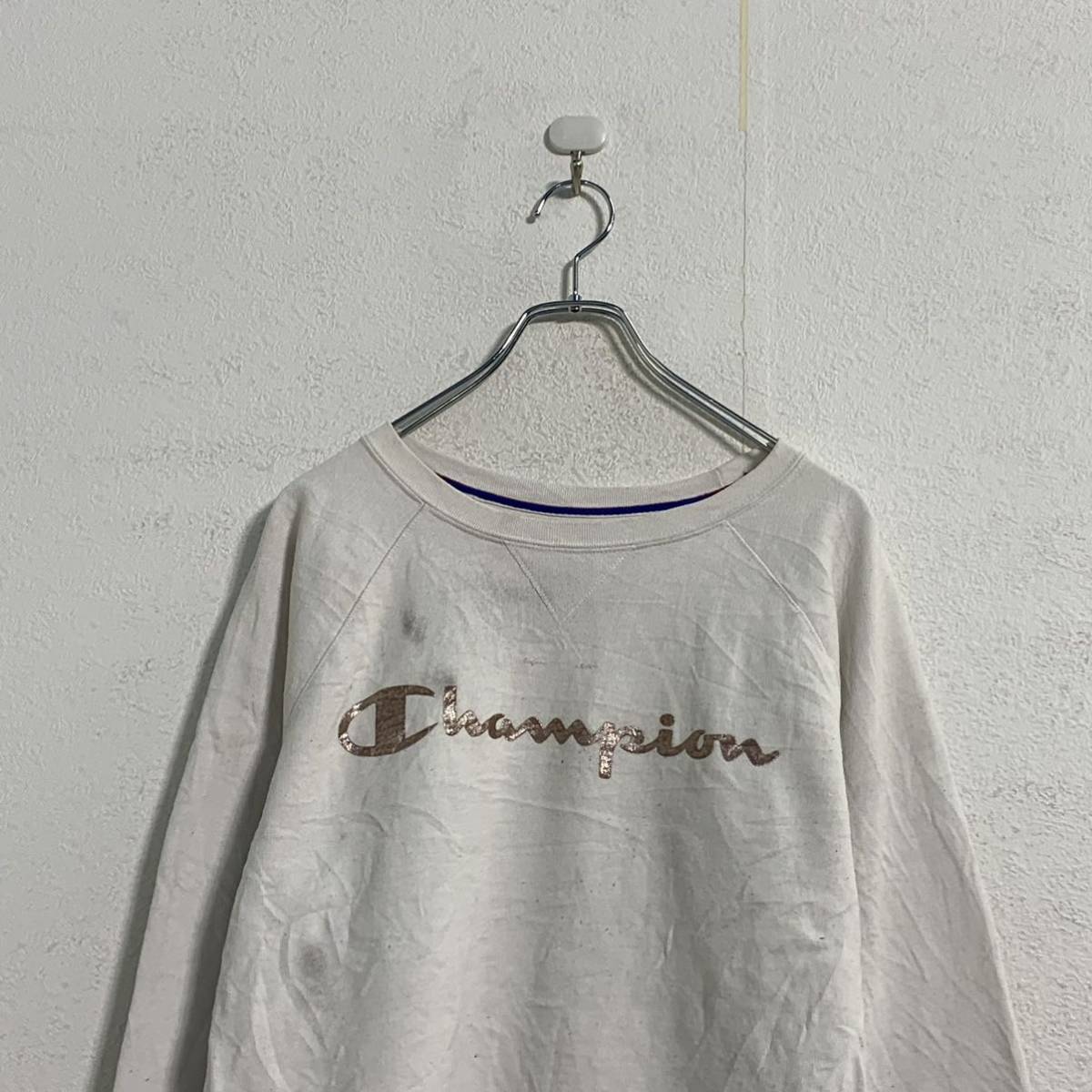 Champion スウェット プリント ロゴ トレーナー L ホワイト ピンクゴールド チャンピオン 大きめ 古着 古着卸 アメリカ仕入 a508-6579