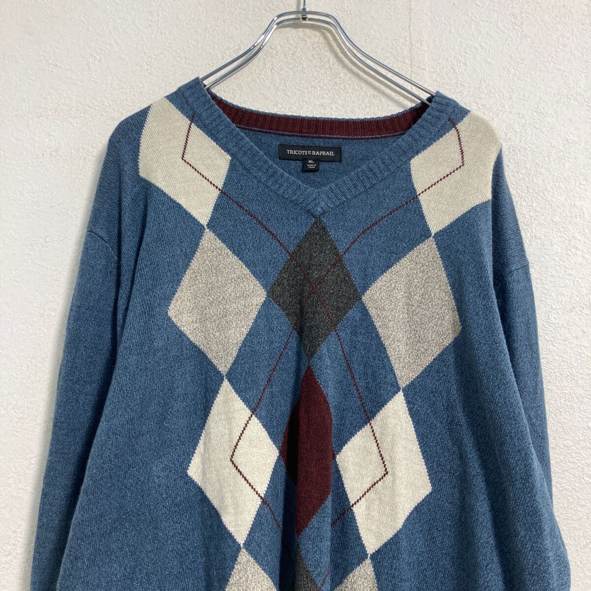 TRICOTS ST RAPHAEL アクリル ニット セーター XL ブルー ビッグサイズ アーガイル Vネック 古着卸 アメリカ仕入 a610-5205