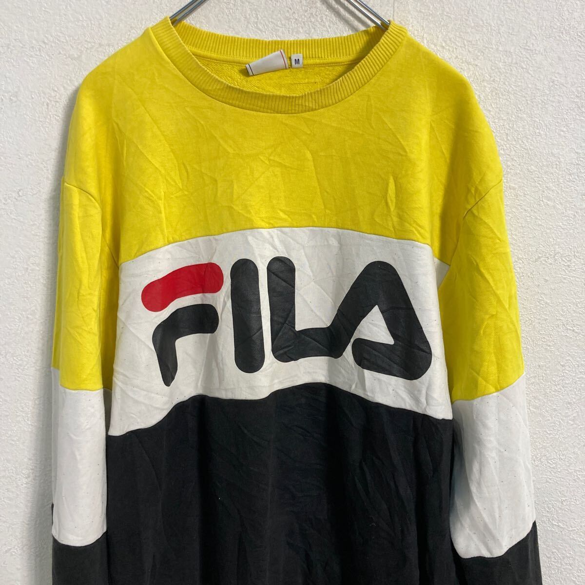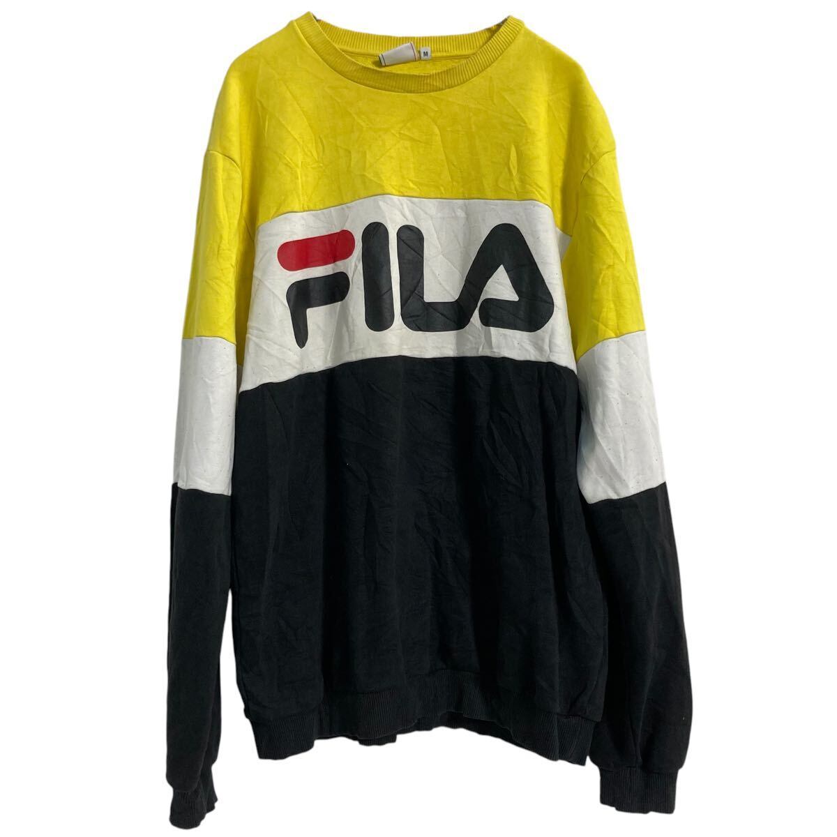 FILA プリント スウェット トレーナー フィラ M イエロー ブラック ホワイト スポーツ ロゴ 裏起毛 古着卸 アメリカ仕入 a610-7258