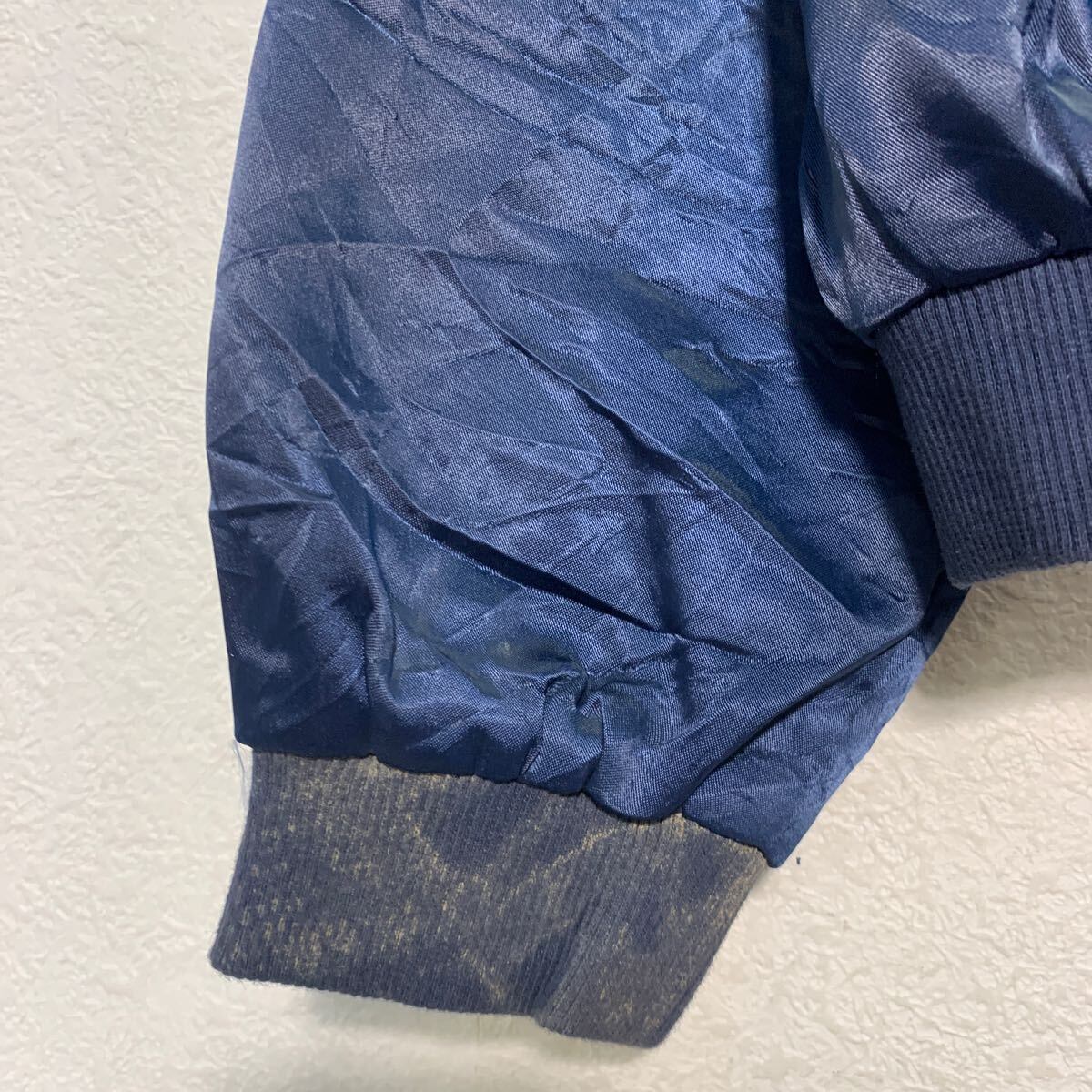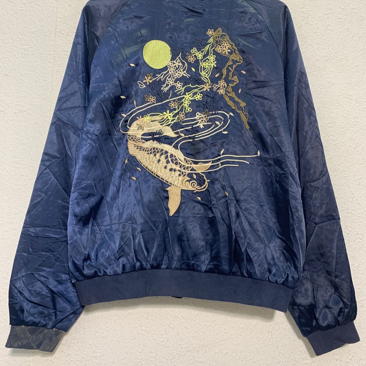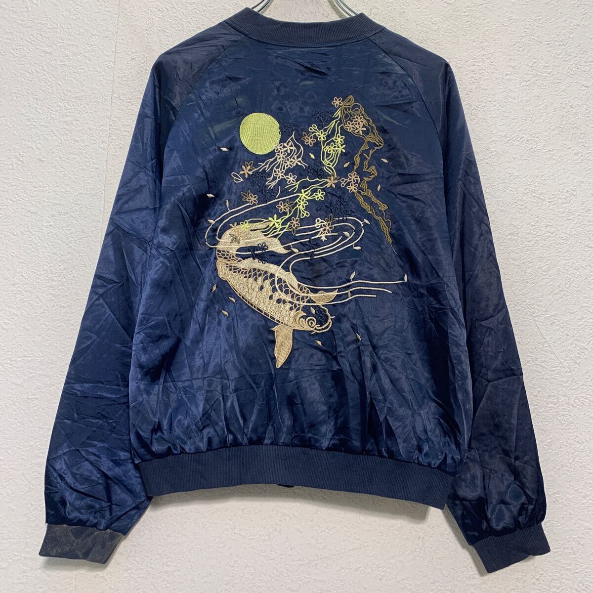 ジャケット M 程 ネイビー ジップアップ バックプリント ラグラン 花柄 鯉 刺繍 ポケット付き 古着卸 アメリカ仕入 a611-5447