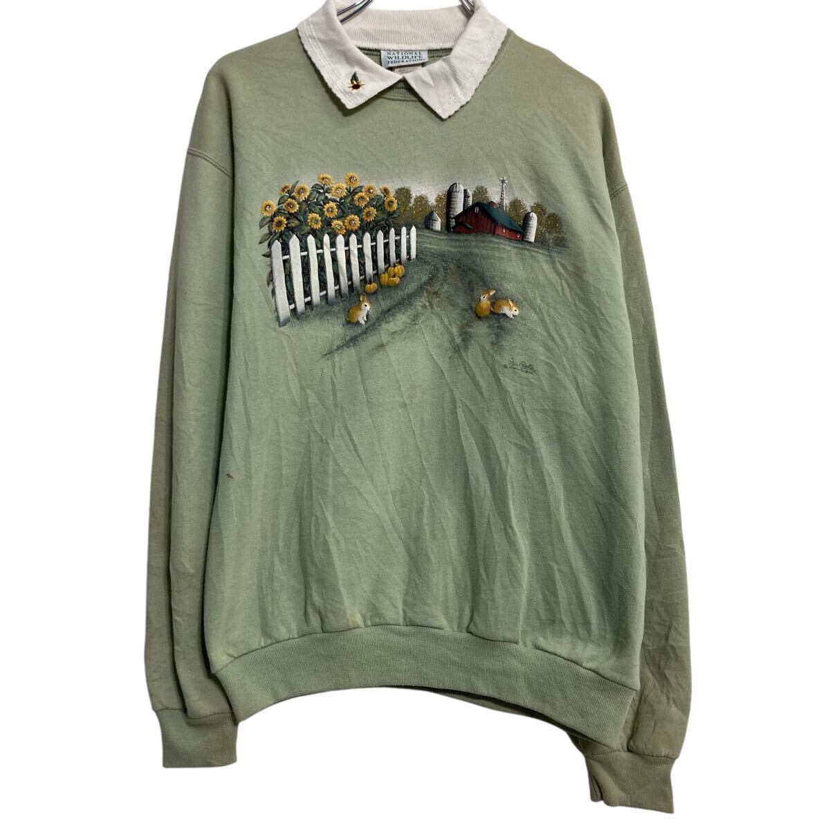 プリントスウェット トレーナー レディース M ライトグリーン ホワイト プルオーバー 襟付き 裏起毛 古着卸 アメリカ仕入 a611-6874