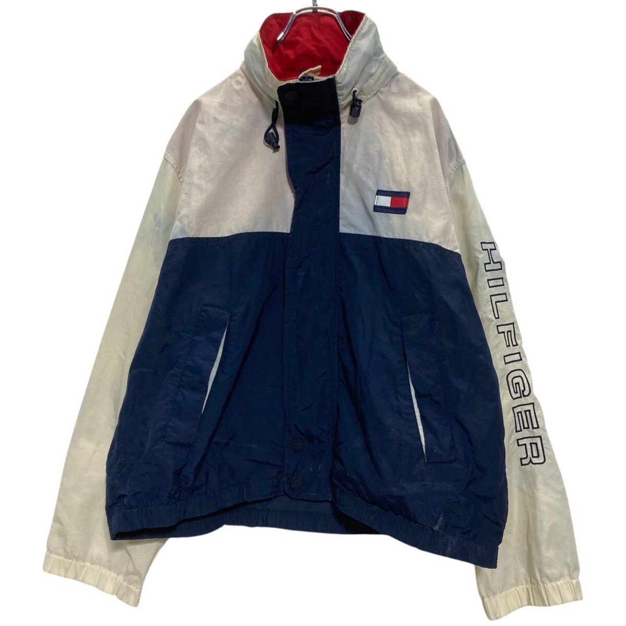 TOMMY HILFIGER ジップアップ ナイロンジャケット S ホワイト ネイビー レッド トミーヒルフィガー 袖ロゴ 古着卸 アメリカ仕入 a612-5902