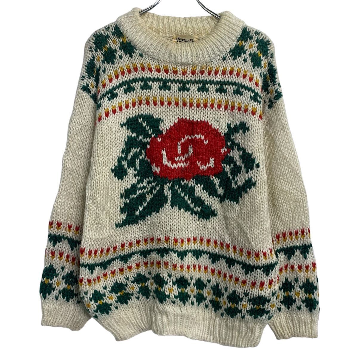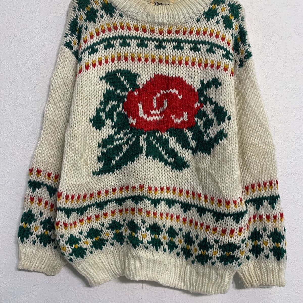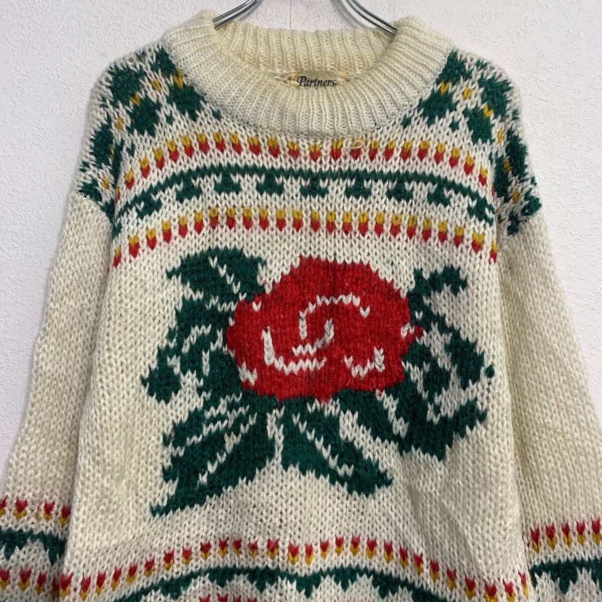 アクリルニット セーター M ホワイト レッド グリーン マルチカラー プルオーバー 花柄 刺繍 秋冬 古着卸 アメリカ仕入 a612-7037