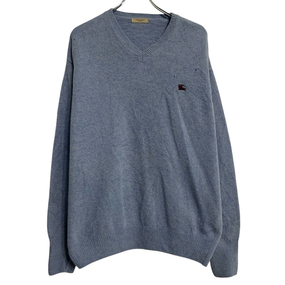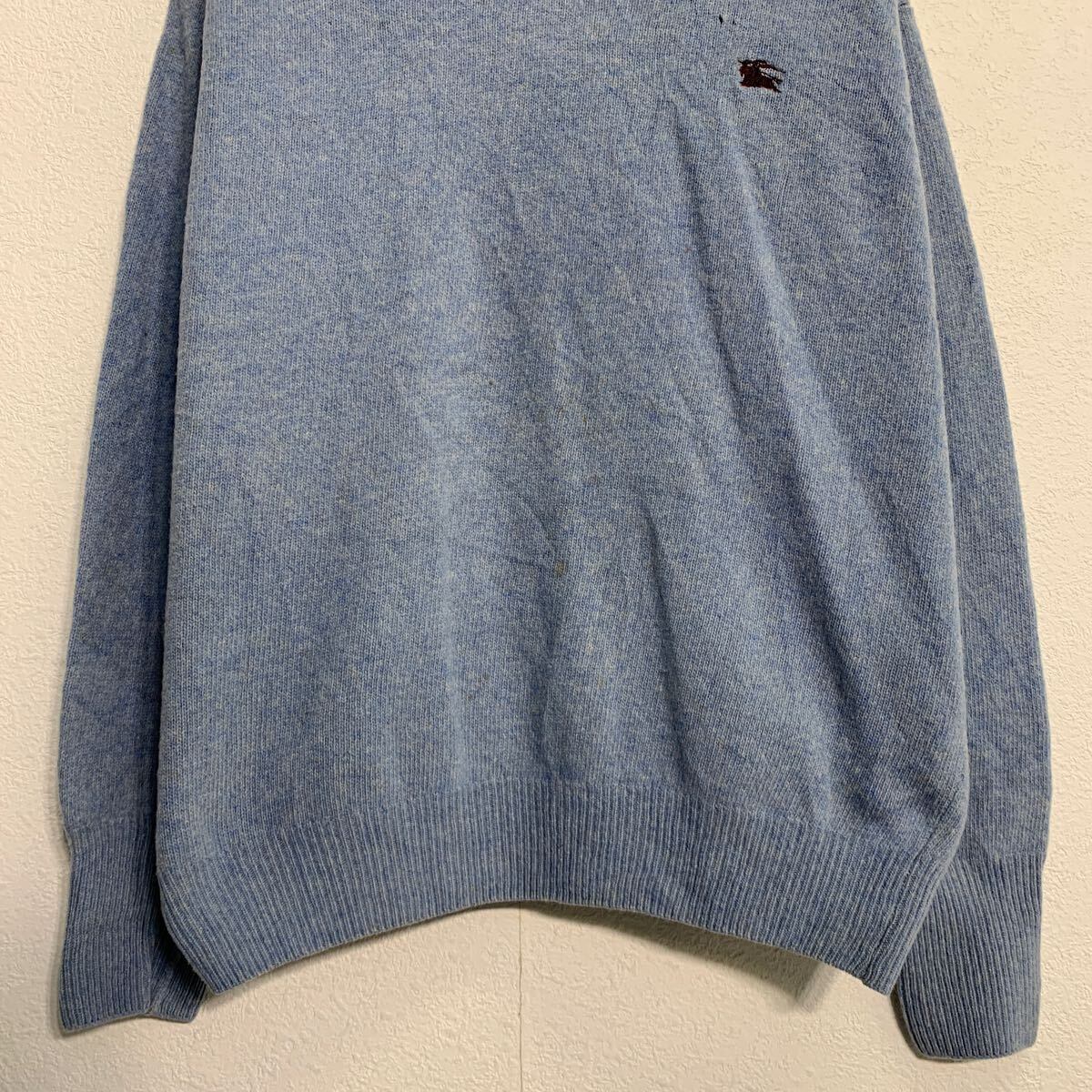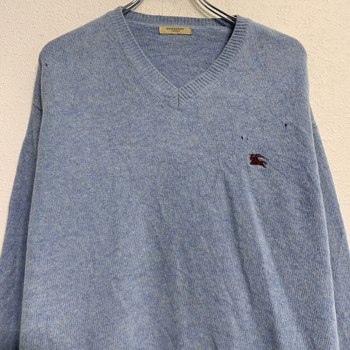 BURBERRY ウールニット セーター XL 程 ブルー バーバリー プルオーバー ビッグサイズ Vネック ロゴ 刺繍 古着卸 アメリカ仕入 a701-6603
